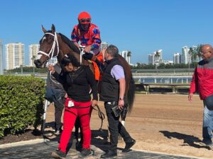 Hubo sorpresa en los 7 furlongs del Carry Back Stakes(arena), esta tarde, en Gulsftream Park. Here Comes...