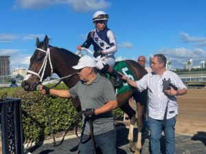 Tiffany Gold(Speightster) volvió a la senda del triunfo en la grama de Gulsftream Park, la alazana que...